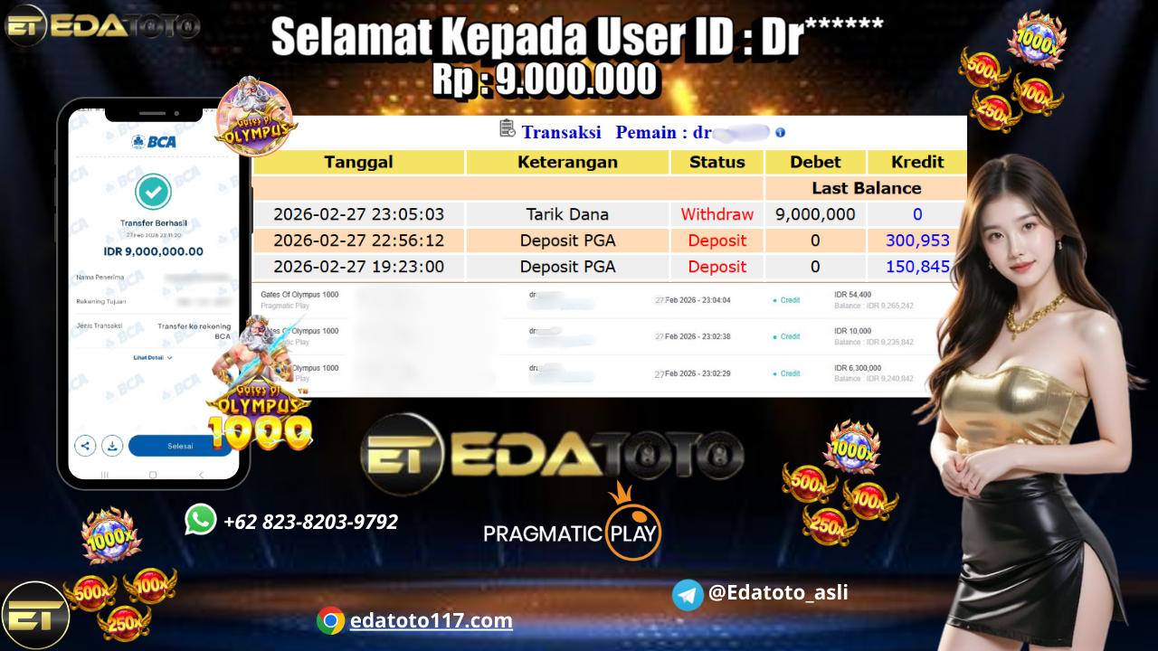 Selamat Kepada Pemilik user ID : Dr****** Hari/Tanggal : Jumat/ 27 februari 2026 Jackpot : Rp, 6,300,000 JT Withdraw : . . .